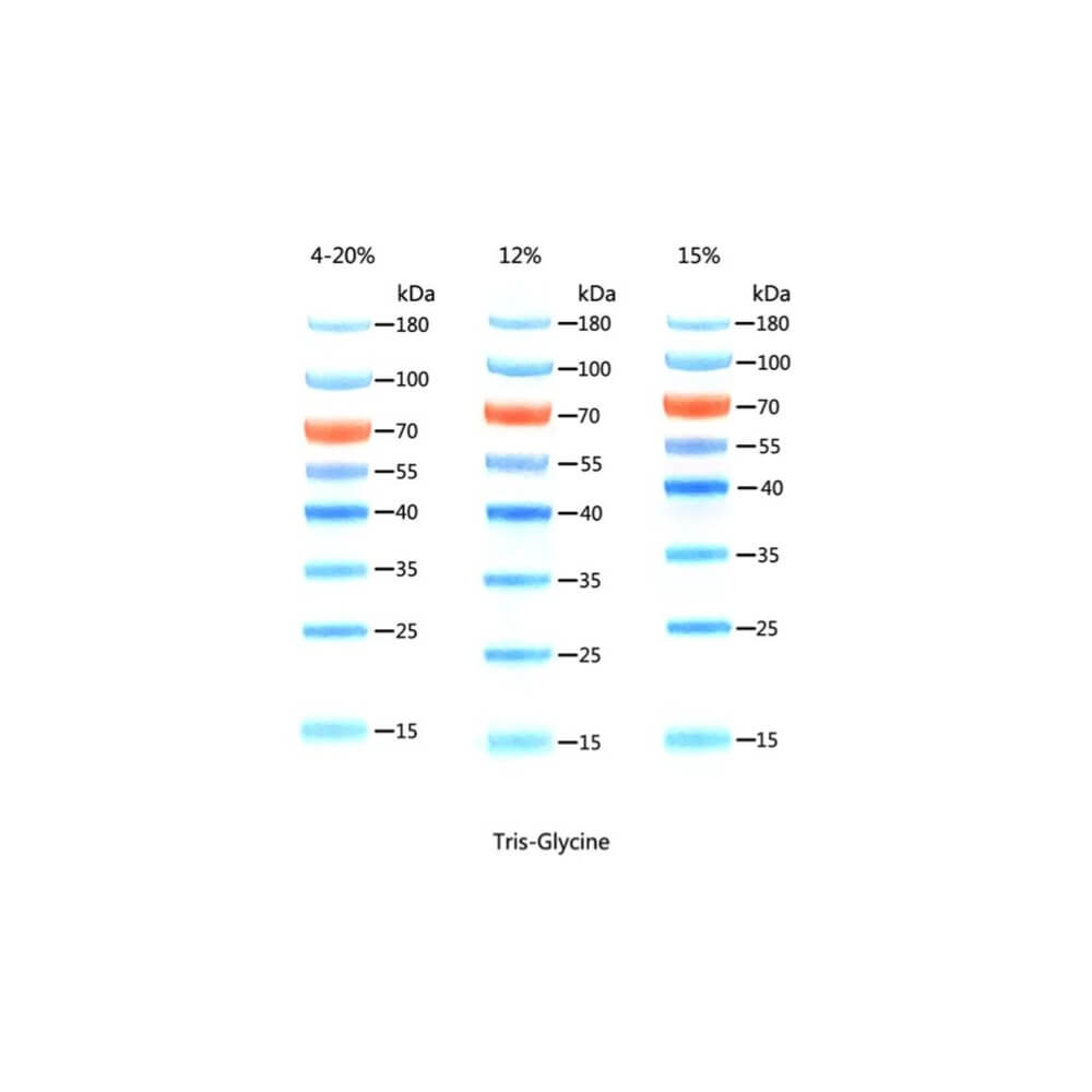 | 条带分子量 (kDa) | 15, 25, 35, 40, 55, 70, 100, 180 | 10, 15, 25, 35, 40, 55, 70, 100, 150, 250 | 10, 15, 25, 35, 40, 55, 70, 100, 130, 180 | 10, 15, 25, 30, 35, 40, 55, 70, 80, 100, 150, 250 |