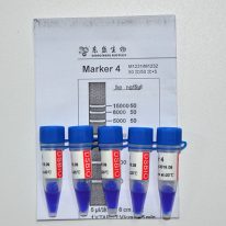 Marker 4是由6条双链线状DNA片段混合而成的DNA分子量标准(DNA Marker/ DNA Ladder),适用于确定500 bp至15 kb的线性双链DNA片段大小,指示带为2500 bp,便于电泳后观察。每条带都通过严格的物理定量,可用于测定目的片段的大小和含量。