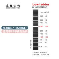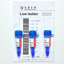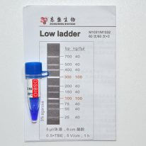 Low Ladder是由10条双链线状DNA片段混合而成的DNA分子量标准(DNA Marker/ DNA Ladder),适用于确定25 bp至700 bp的线性双链DNA片段大小,两条指示带为100 bp和300 bp,便于电泳后观察。每条带都通过严格的物理定量,可用于测定目的片段的大小和含量。