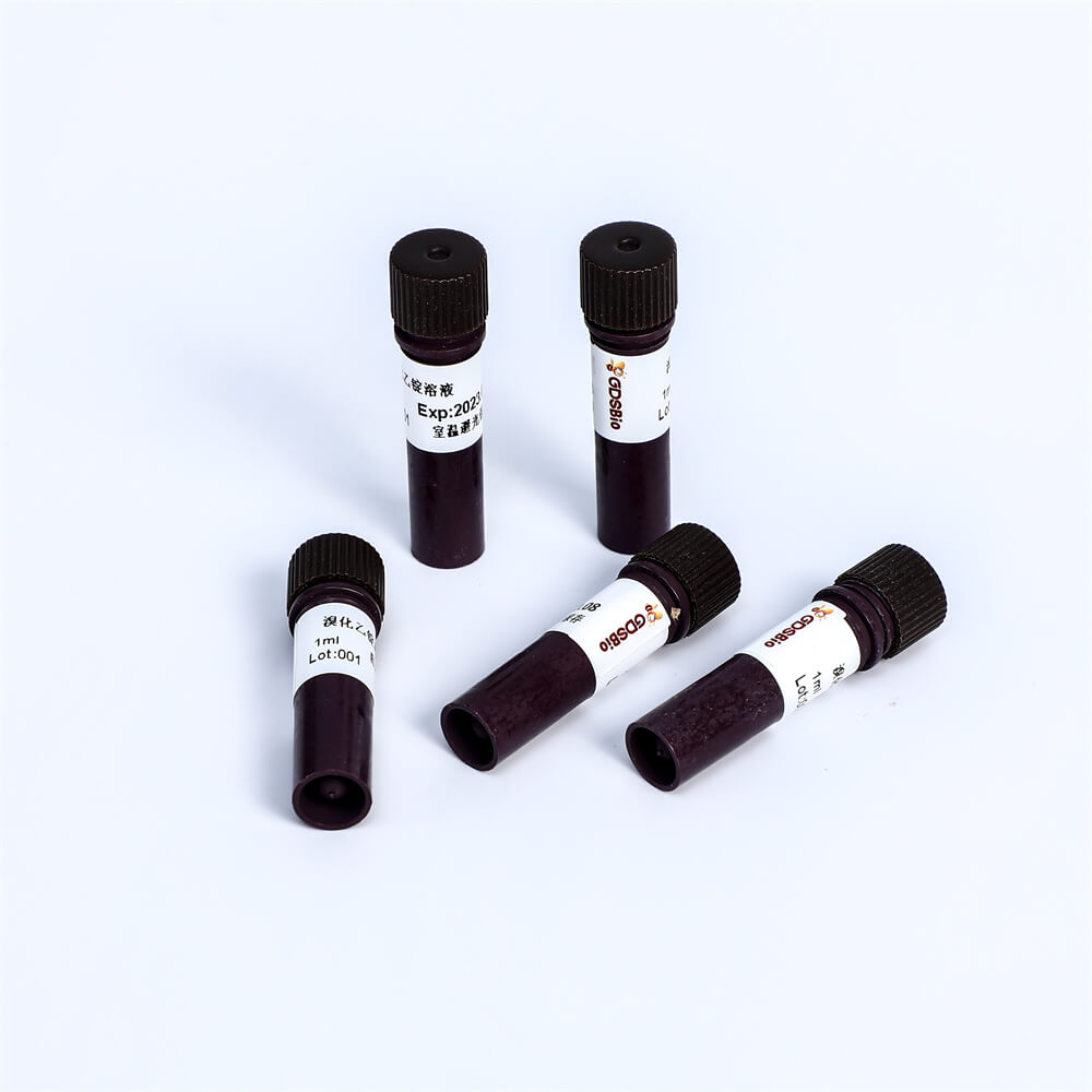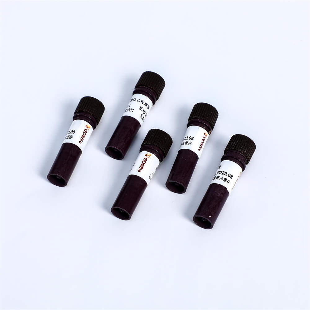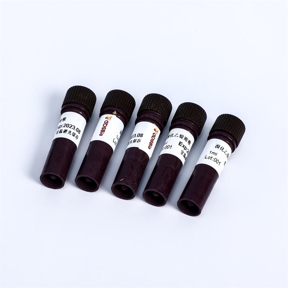 溴化乙锭(Ethidium Bromide, EB)是一种灵敏的荧光染料,常用于 DNA 和 RNA 琼脂糖凝胶检测。溴化乙锭是一种 DNA 嵌入 剂,能够插入双螺旋 DNA 碱基对之间。溴化乙锭的最大紫外吸收波长为 300 和 360 nm,最大发射波长为 590 nm。与溴化乙 锭结合的 DNA 检出限为 0.5-5.0 ng/条带。本品以水溶液形式提供,由 10mg/ml 溴化乙锭和高纯度水组成。