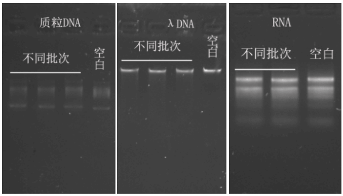 P1101与质粒DNA、λDNA、RNA共同孵育,琼脂糖凝胶电泳结果显示质粒DNA、λDNA、RNA没有明显降解,表明P1101中没有明显的脱氧核糖核酸酶、核糖核酸酶残留。