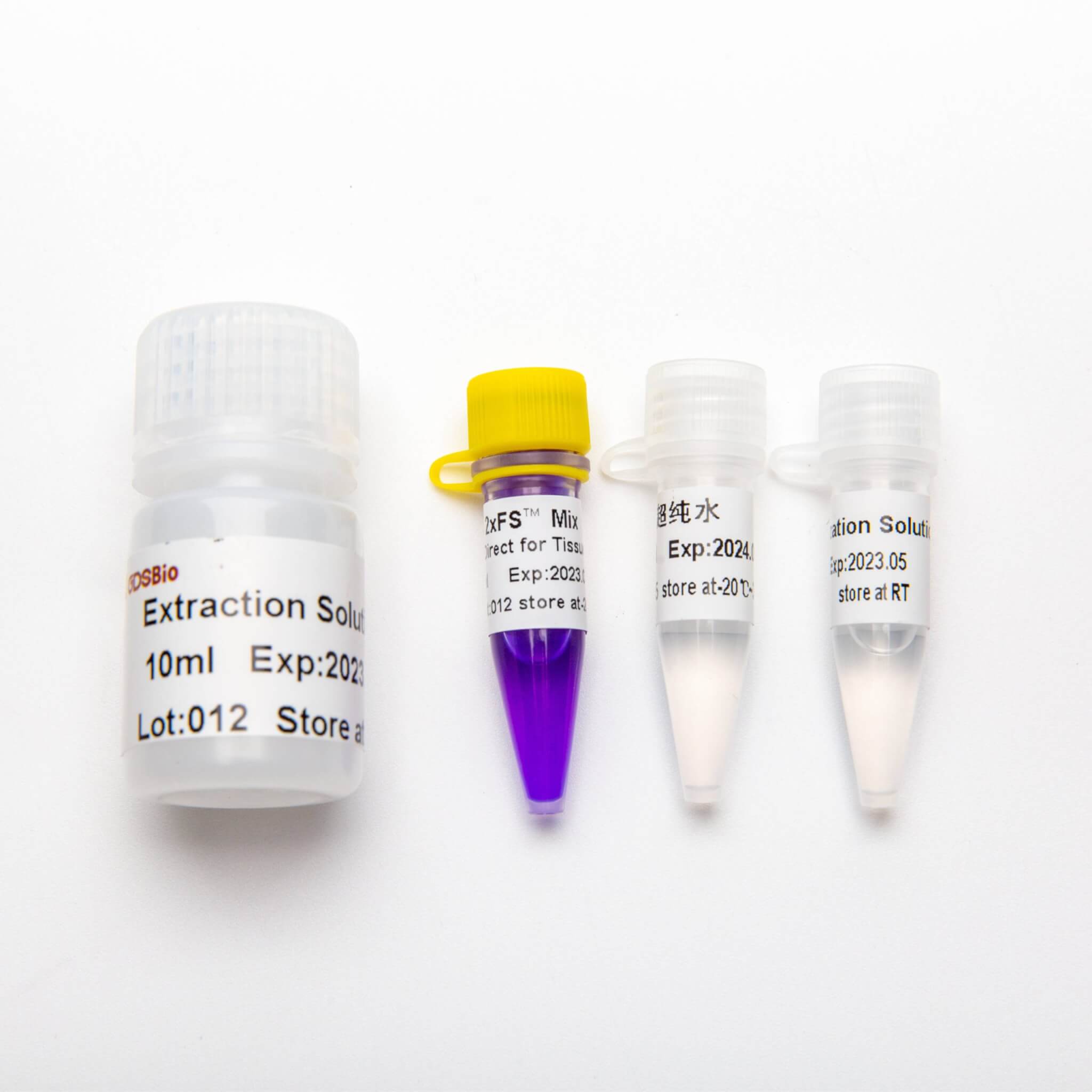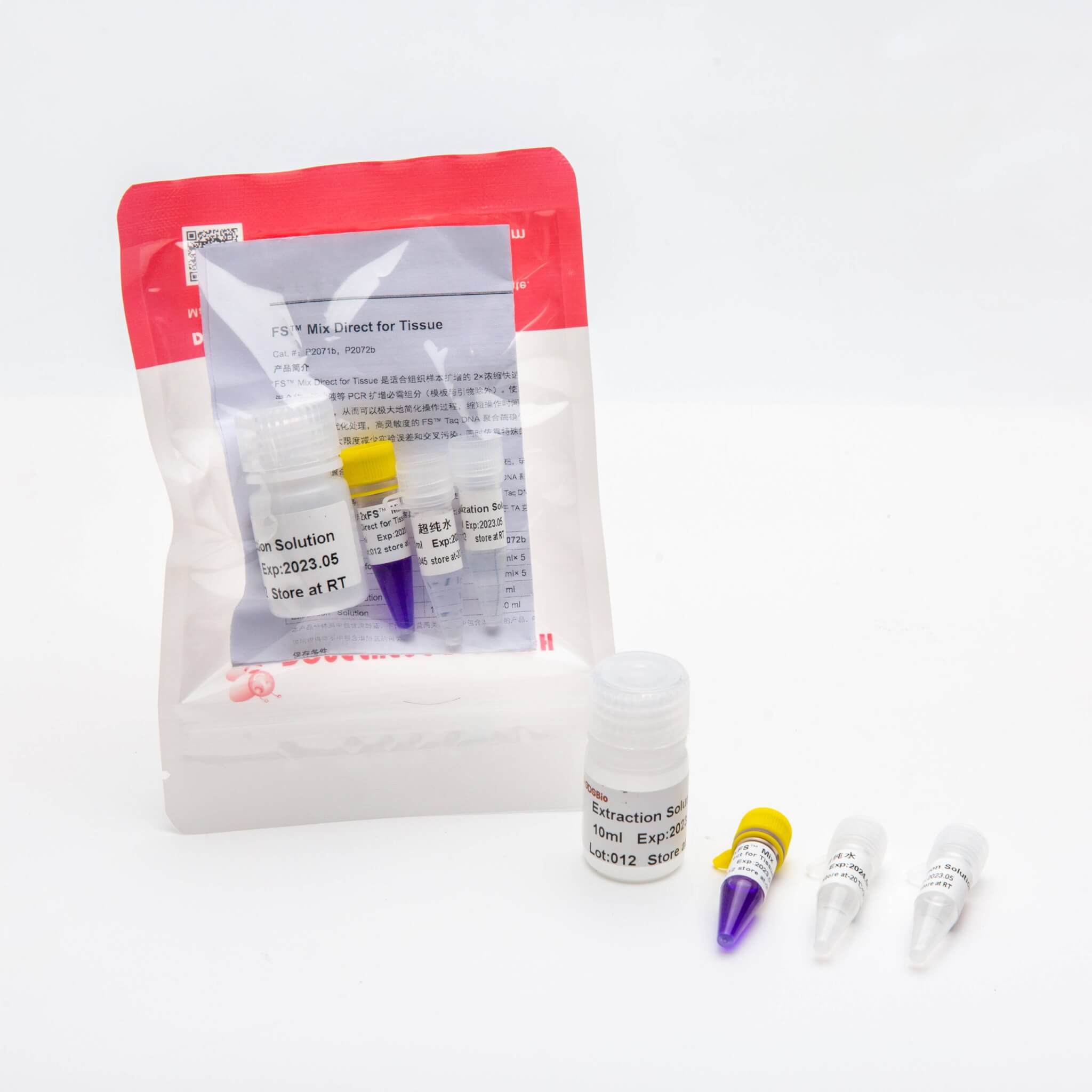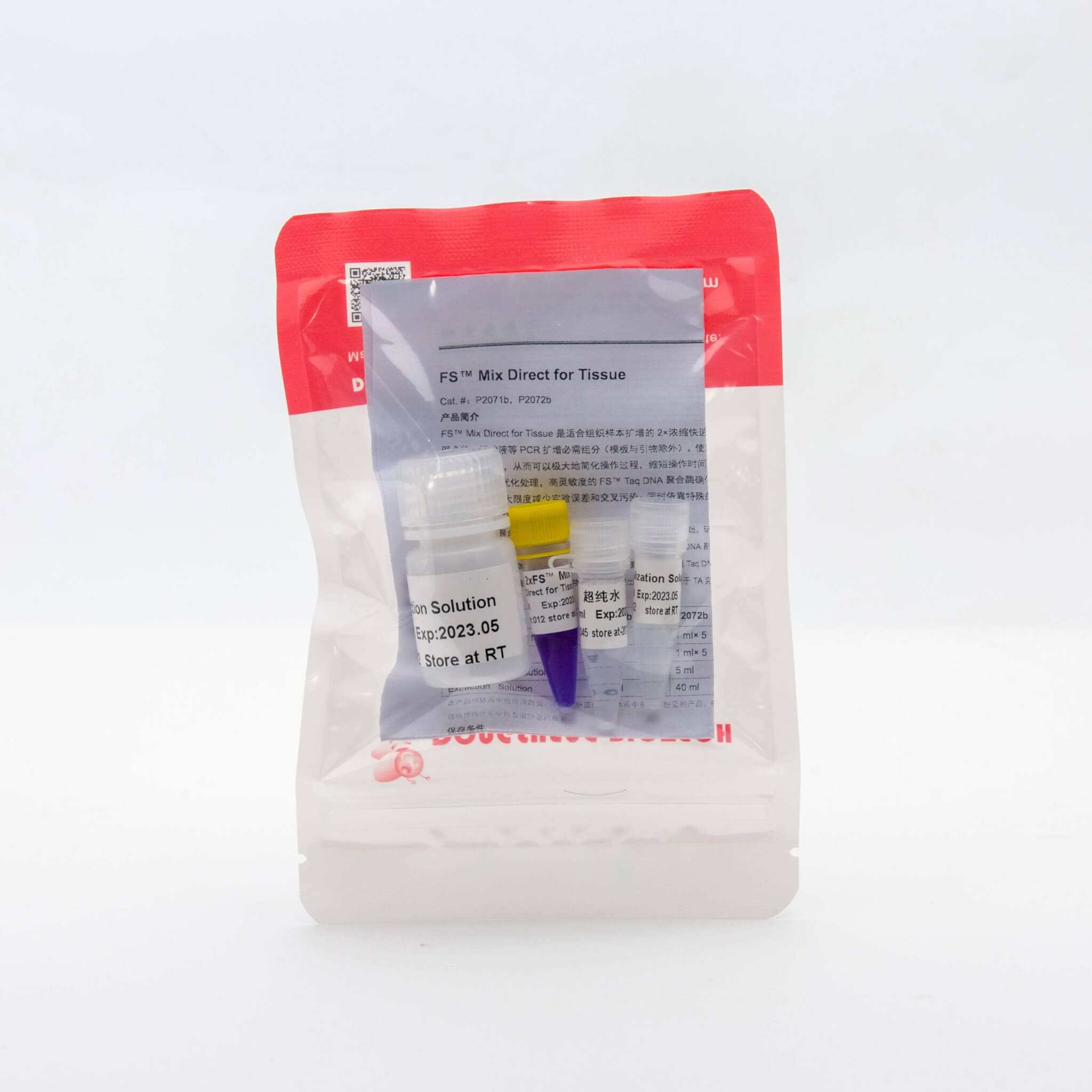 FS™ Mix Direct for Tissue是适合组织样本扩增的2×浓缩快速高效PCR预混合溶液,含有FS™ Taq DNA聚合酶、dNTP混合物、缓冲液等PCR扩增必需组分(模板与引物除外)。使用时,仅需在扩增体系中加入简单处理后的样本处理液和引物即可进行PCR,从而可以极大地简化操作过程,缩短操作时间,降低污染(加样次数减少)。FS™ Mix Direct for Tissue的反应体系经过优化处理,高灵敏度的FS™ Taq DNA聚合酶确保处理液中的微量样本得到高效扩增。本产品不用进行繁琐的DNA提取,最大限度减少实验误差和交叉污染;同时依靠特殊的缓冲体系增强PCR扩增的特异性,保证扩增效果与DNA模板扩增效果同样可靠。