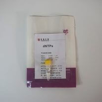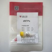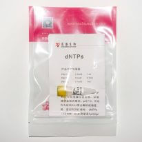 dNTPs混合物是dATP、dGTP、dCTP和dTTP的等摩尔混合物。以溶液钠盐形式提供,pH7.0。可以作为耐热DNA聚合酶的底物使用。进行PCR扩增时, dNTPs(2.5 mM)标准用量是4 μl/ 50 μl反应体系,dNTPs(10 mM)标准用量是1 μl/ 50 μl反应体系,终浓度为200 μM。