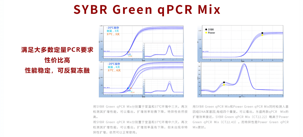 SYBR® Green qPCR Mix (High ROX+)是2X浓缩的实时定量PCR预混液,使用时只需加入模板和引物即可进行反应。采用创新的热启动机制可以减少引物二聚体和其他次级产物对反应的干扰,可以显著提高定量PCR的特异性、扩增效率,得到更广的可定量扩增区域。采用了新的增强剂,对各种目的片段 PCR 效率的波动可控制在最小范围内,反复冻融对扩增性能影响极小。本品预混了进口参比染料ROX,适用于需要高浓度ROX校正的定量PCR机型,如ABI StepOnePlus等。