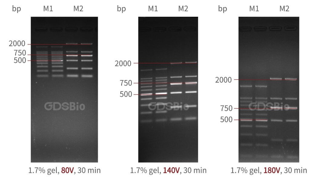 电压越高,电泳越快,但分辨率和凝胶完整性可能受影响;低电压迁移慢,却能获得更清晰、更可靠的分离效果。